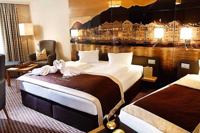 O Hotel Innsbruck está localizado nas margens do Rio Inn no centro histórico, apenas a 5 minutos a pé do centro de congressos e do Teleférico Hungerburgbahn. O hotel dispõe de piscina interior e duas áreas de spa de acesso gratuito. A área de spa panorâmica (área de nudismo) sobre os telhados da zona histórica da cidade, inclui bio-sauna finlandesa, uma cabina de infravermelhos e um terraço para banhos de sol. As comodidades da área de spa com piscina interior (área interdita ao nudismo) incluem sauna finlandesa, e banho de vapor de aromaterapia. O Hotel também dispõe de um bar, de parque de estacionamento subterrâneo e de uma sala para armazenamento de equipamento de esqui.