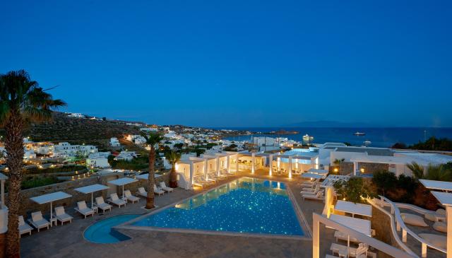 Este hotel está situado a 2 minutos a pé da praia de Psarou, em Mykonos, e oferece alojamento romântico com vistas da piscina ou do mar Egeu.